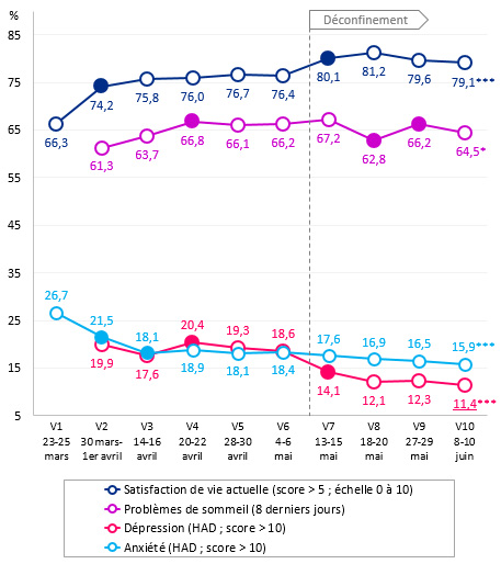 Notes de lecture : Évolutions testées entre échantillons comparables en termes de sexe, âge, CSP, taille d’agglomération et région d’habitation. Lorsqu’une marque (rond) est pleine, la proportion est significativement différente de celle de la vague précédente, test de Wald ajusté, p<0,05. Lorsque la dernière proportion de la série (Vague 10) est associée à une étoile, cette proportion est significativement différente de celle du premier point de la série (Vague 1 ou 2 selon l’indicateur), test de Wald ajusté, * : p<0,05 ; ** : p<0,01 ; *** : p<0,001 ; lorsqu’elle est soulignée, cette proportion est significativement différente de celle de la première vague de la période postconfinement (Vague 7), test de Wald ajusté, p<0,05. HAD : Hospital Anxiety and Depression scale.